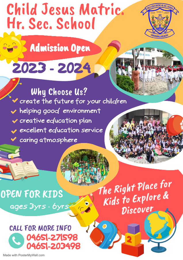"Child Jesus Metric Hr. Sec. School Unnamalaikadai is committed to the Pursuit of excellence in teaching and learning. The motto invented “Lead Kindly Light” will inspire the students to put into action the meaningful aim of real education. "